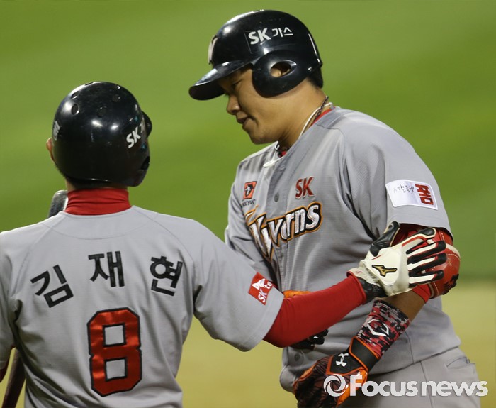 (서울=포커스뉴스) 3일 서울 잠실구장에서 열린 2016 프로야구 SK-LG 경기 8회초 1사 1루에서 SK 최승준이 우중월 2점 홈런을 치고 김재현의 환영을 받으며 홈인하고 있다.