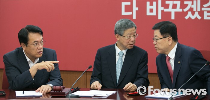 (서울=포커스뉴스) 4일 오전 서울 여의도 새누리당사에서 열린 혁신비상대책위원회의에 참석한 김희옥(가운데) 위원장과 정진석(왼쪽) 원내대표, 김광림 정책위의장이 대화하고 있다.