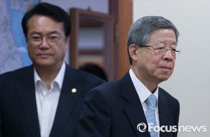 (서울=포커스뉴스) 4일 오전 서울 여의도 새누리당사에서 열린 혁신비상대책위원회의에 참석한 김희옥(오른쪽) 위원장과 정진석 원내대표가 참석하고 있다.