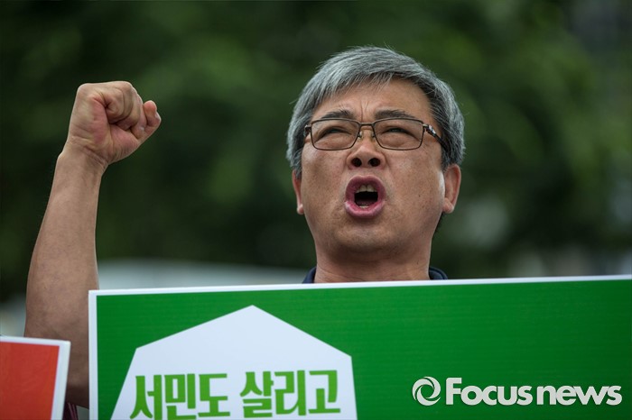 (서울=포커스뉴스) 4일 오전 서울 종로구 정부서울청사 앞에서 양대노총의 최저임금 대폭인상 및 노동자위원 중대 결단을 예고하는 기자회견이 열리고 있다.