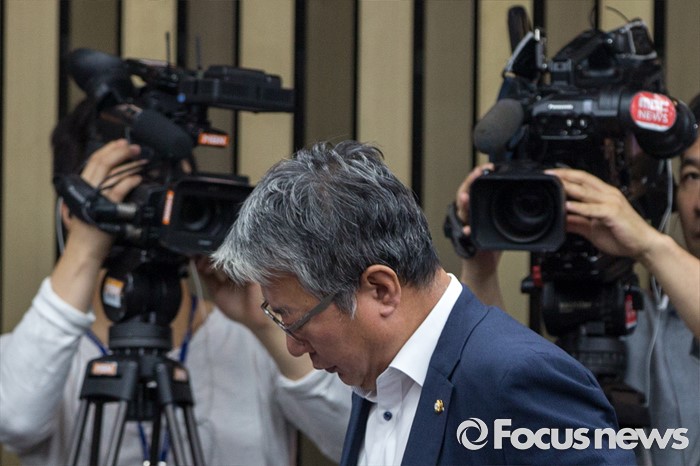 (서울=포커스뉴스) MBC 고위 간부가 성추행했다는 근거없는 사실을 주장해 명예훼손 논란에 휩싸인 조응천 더불어민주당 의원이 4일 오전 서울 여의도 국회에서 열린 의원총회에 참석하기 위해 회의실로 들어서고 있다.