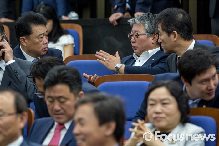 (서울=포커스뉴스) MBC 고위 간부가 성추행했다는 근거없는 사실을 주장해 명예훼손 논란에 휩싸인 조응천 더불어민주당 의원이 4일 오전 서울 여의도 국회에서 열린 의원총회에 참석해 동료 의원들과 대화를 나누고 있다.