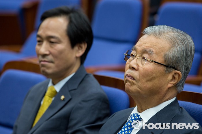 (서울=포커스뉴스) 김종인(오른쪽) 더불어민주당 비상대책위 대표와 우상호 원내대표가 4일 오전 서울 여의도 국회에서 열린 의원총회에 참석 하고 있다.