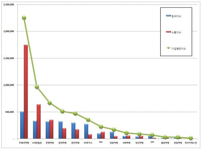 브랜드 평판지수는 브랜드에 대한 소비자들의 활동 빅데이터를 △참여가치 △소통가치 △소셜가치 △시장가치 △재무가치로 나누게 된다. 택배 브랜드 평판조사에선 참여지수와 소통지수만 분석했다.