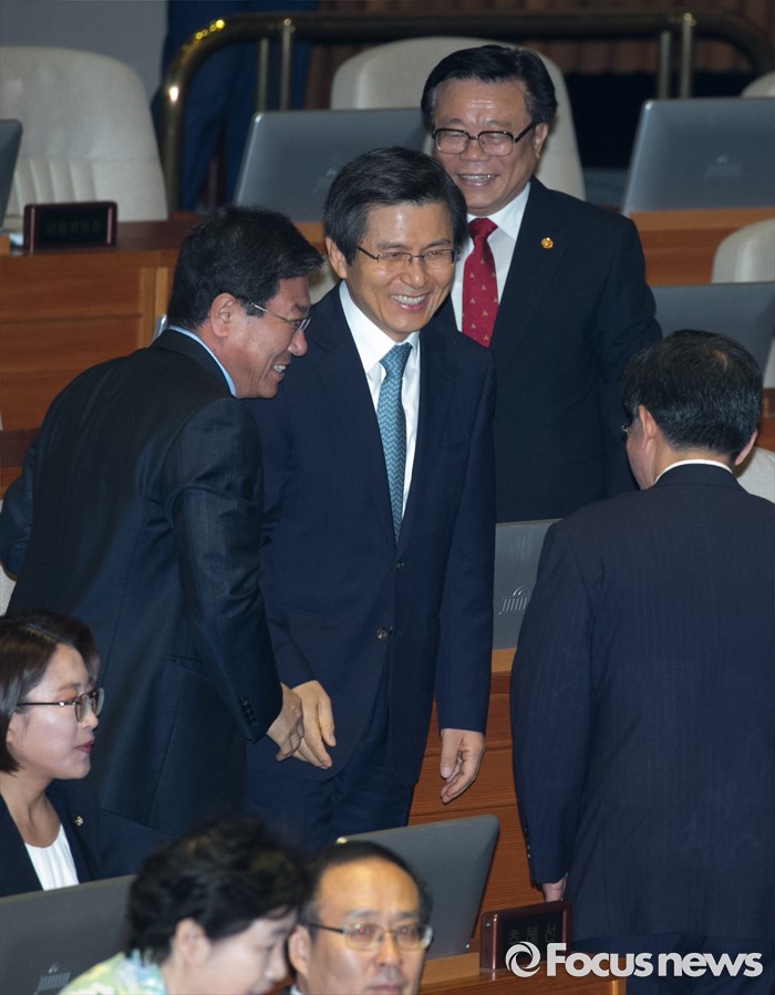 (서울=포커스뉴스) 4일 오전 서울 여의도 국회에서 열린 343회 국회(임시회) 6차 본회의, 경제에 관한 대정부 질문에 참석한 황교안 국무총리가 윤상직 새누리당 의원 등 의원들과 인사하고 있다.