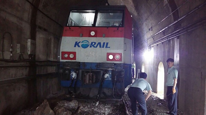 (서울=포커스뉴스) 4일 오전 8시 30분께 경북 봉화군 석포역에서 영주역 방향으로 향하던 무궁화호 1671호 열차가 낙석으로 탈선하는 사고가 발생해 코레일 관계자들이 수습작업을 하고 있다. <사진제공=봉화군>