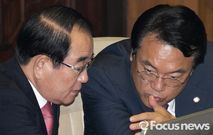 (서울=포커스뉴스) 4일 오전 서울 여의도 국회에서 열린 343회 국회(임시회) 6차 본회의, 경제에 관한 대정부 질문에 참석한 정진석(오른쪽) 새누리당 원내대표와 박명재 사무총장이 대화하고 있다.