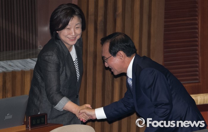 (서울=포커스뉴스) 4일 오전 서울 여의도 국회에서 열린 343회 국회(임시회) 6차 본회의, 경제에 관한 대정부 질문에 참석한 심상정(왼쪽) 정의당 상임대표와 비교섭단체 대표연설을 마친 노회찬 원내대표가 악수하고 있다.