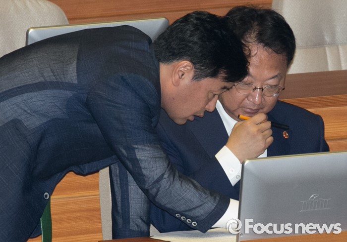 (서울=포커스뉴스) 4일 오전 서울 여의도 국회에서 열린 343회 국회(임시회) 6차 본회의, 경제에 관한 대정부 질문에 참석한 유일호(오른쪽) 경제부총리 겸 기획재정부 장관과 김관영 국민의당 원내수석부대표가 대화하고 있다.