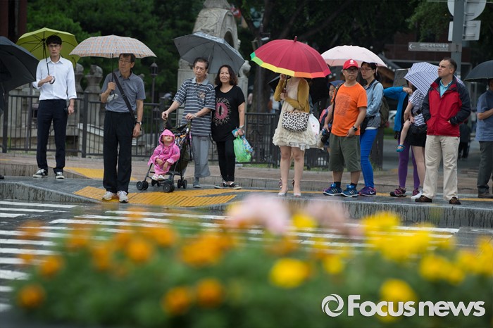 (서울=포커스뉴스) 전국에 호우주의보가 내려진 4일 오전 서울 종로구 광화문 광장에서 시민들이 우산을 쓰고 횡단보도를 걷고 있다.