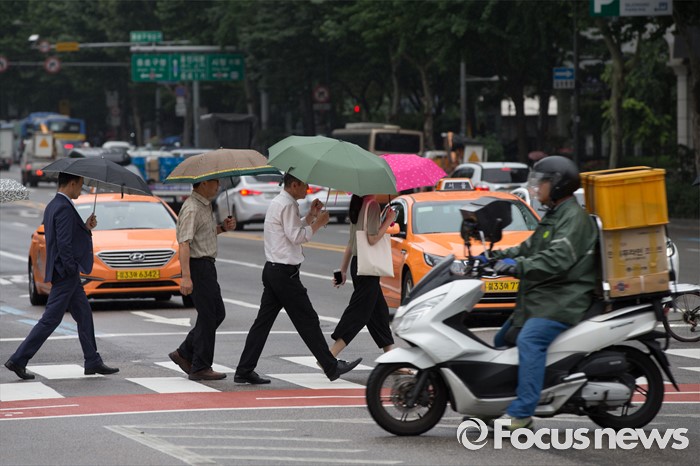 (서울=포커스뉴스) 전국에 호우주의보가 내려진 4일 오전 서울 종로구 광화문 광장에서 시민들이 우산을 쓰고 횡단보도를 걷고 있다.