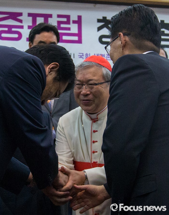 (서울=포커스뉴스) 염수정(가운데) 추기경과 박지원(오른쪽) 국민의당 비상대책위원장, 정진석 새누리당 원내대표가 4일 오전 서울 여의도 국회의원회관에서 열린 '생명존중포럼 창립총회'에 참석해 행사를 마친 뒤 인사 하고 있다.
