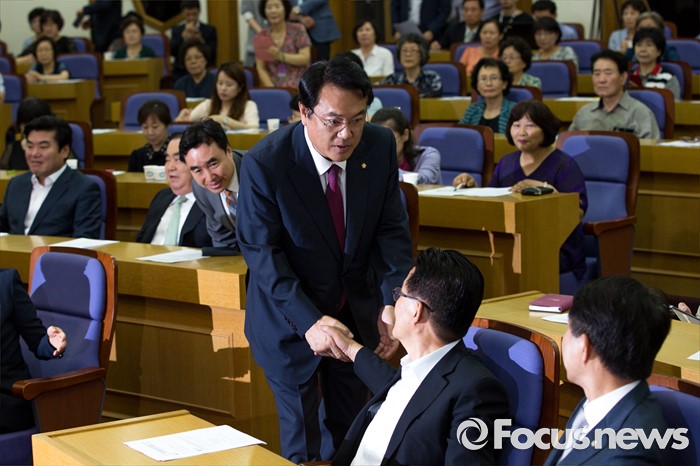(서울=포커스뉴스) 박지원(오른쪽 두 번째) 국민의당 비상대책위원장과 정진석(오른쪽 세 번째) 새누리당 원내대표가 4일 오전 서울 여의도 국회의원회관에서 열린 '생명존중포럼 창립총회'에 참석해 악수 하고 있다.