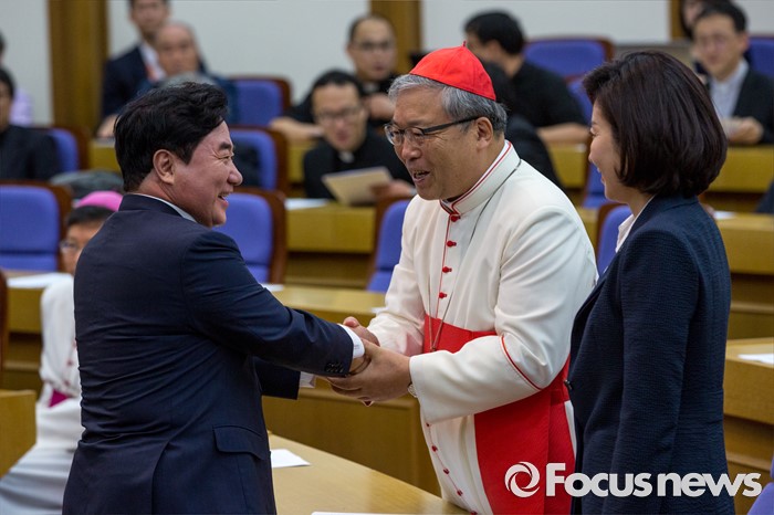 (서울=포커스뉴스) 염수정(가운데) 추기경과 이석현 더불어민주당 의원이 4일 오전 서울 여의도 국회의원회관에서 열린 '생명존중포럼 창립총회'에 참석해 악수 하고 있다.