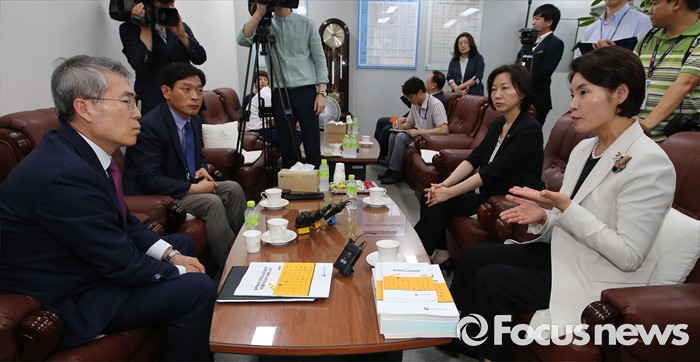 (세종=포커스뉴스) 국회 환경노동위원회 한정애 더불어민주당 간사가 4일 오후 세종시 정부세종청사 최저임금위원회를 찾아 박준성 위원장과 면담을 나누고 있다. 오른쪽 두번째는 송옥주 의원.