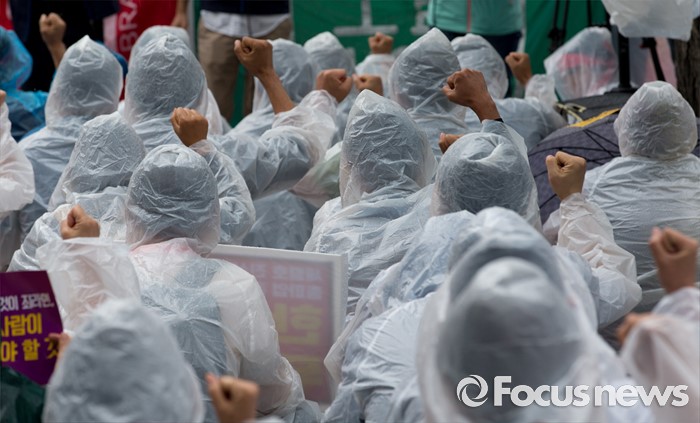 (서울=포커스뉴스) 4일 오후 서울중앙지방법원 앞에서 전국민주노동조합총연맹이 한상균 위원장 석방 판결 촉구 결의대회를 하고 있다.