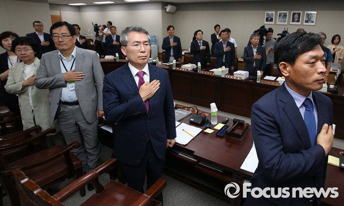 (세종=포커스뉴스) 4일 오후 세종시 정부세종청사 고용노동부 최저임금위원회 전원회의실에서 열린 제8차 전원회의에서 박준성 위원장과 위원들이 국기에 대한 경례를 하고 있다.