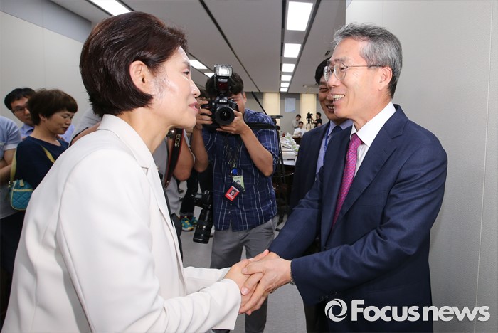 (세종=포커스뉴스)한정애(왼쪽) 국회 환노위 더불어민주당 간사가 4일 오후 세종시 정부세종청사 고용노동부 최저임금위원회 전원회의실에서 열린 제8차 전원회의를 방문, 박준성 위원장과 악수를 하고 있다.