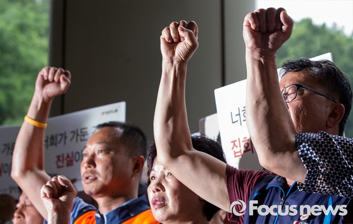 (서울=포커스뉴스) 4일 오후 서울중앙지법 앞에서 한상균 민주노총 위원장의 1심 선고 공판 후 열린 기자회견에 참석한 최종진 부위원장 및 조합원들이 판결의 부당함을 주장하는 구호를 외치고 있다. 지난해 11월 열린 민중총궐기 대회 불법 시위 주도 혐의로 기소된 한 위원장은 이날 열린 1심 재판에서 징역 5년을 선고받았다.