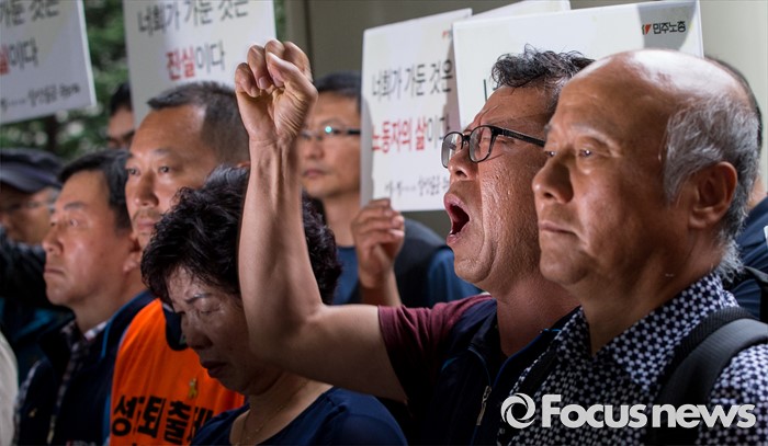 (서울=포커스뉴스) 4일 오후 서울중앙지법 앞에서 한상균 민주노총 위원장의 1심 선고 공판 후 열린 기자회견에 참석한 최종진 부위원장 및 조합원들이 판결의 부당함을 주장하는 구호를 외치고 있다. 지난해 11월 열린 민중총궐기 대회 불법 시위 주도 혐의로 기소된 한 위원장은 이날 열린 1심 재판에서 징역 5년을 선고받았다.