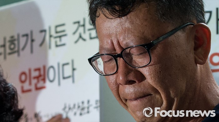 (서울=포커스뉴스) 4일 오후 서울중앙지법 앞에서 한상균 민주노총 위원장의 1심 선고 공판 후 열린 기자회견에 참석한 최종진 부위원장이 판결의 부당함을 주장하며 눈물을 흘리고 있다. 지난해 11월 열린 민중총궐기 대회 불법 시위 주도 혐의로 기소된 한 위원장은 이날 열린 1심 재판에서 징역 5년을 선고받았다.