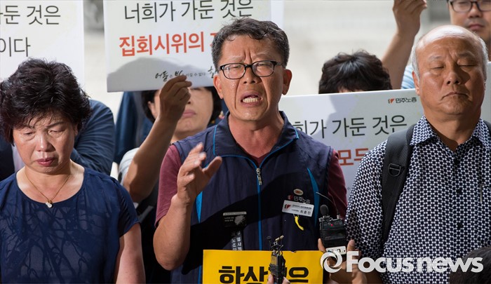 (서울=포커스뉴스) 4일 오후 서울중앙지법 앞에서 한상균 민주노총 위원장의 1심 선고 공판 후 열린 기자회견에 참석한 최종진 부위원장이 판결의 부당함을 주장하고 있다. 지난해 11월 열린 민중총궐기 대회 불법 시위 주도 혐의로 기소된 한 위원장은 이날 열린 1심 재판에서 징역 5년을 선고받았다.