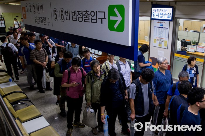 (서울=포커스뉴스) 4일 오후 서울중앙지법 5번 출입구 앞에서 민주노총 조합원 및 관계자들이 한상균 위원장의 1심 선고 공판을 방청하기 위해 줄지어 기다리고 있다. 지난해 11월 열린 민중총궐기 대회 불법 시위 주도 혐의로 기소된 한 위원장은 이날 열린 1심 재판에서 징역 5년을 선고받았다.