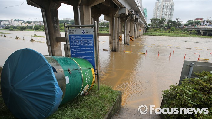 (청주=포커스뉴스) 충청 및 중부지역에 호우경보가 발생한 4일 오후 충북 청주시 무심천 하상도로가 내린비로 잠겨 있다.