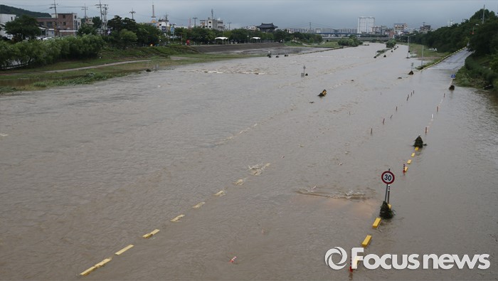 (청주=포커스뉴스) 충청 및 중부지역에 호우경보가 발생한 4일 오후 충북 청주시 무심천 하상도로가 내린비로 잠겨 있다.