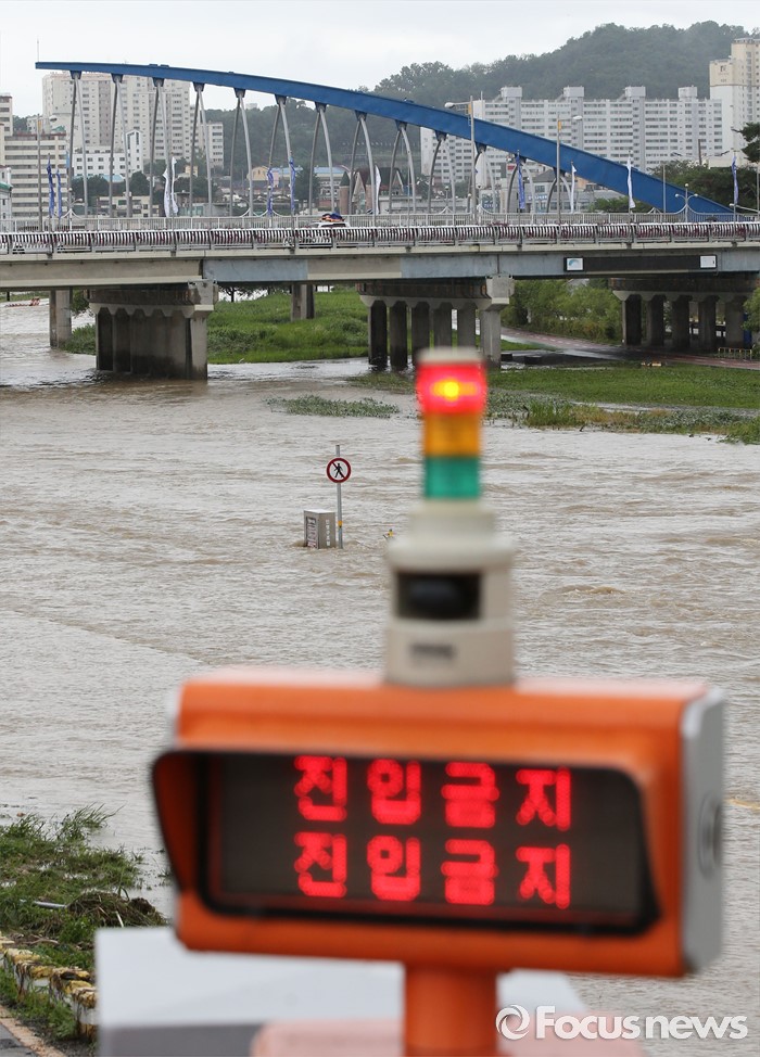 (청주=포커스뉴스) 충청 및 중부지역에 호우경보가 발생한 4일 오후 충북 청주시 무심천 하상도로가 내린비로 잠겨 있다.