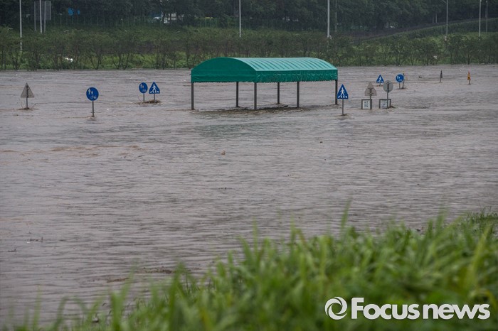(서울=포커스뉴스) 최고 300mm 물폭탄이 내릴 것으로 예고되어 전국적으로 호우주의보와 경보가 내린 5일 오전 서울 중랑구 중랑천 월릉교 인근 둔치의 시민공원이 물에 잠겨 있다.
