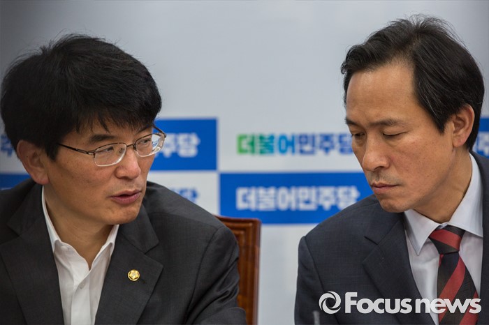 (서울=포커스뉴스) 우상호(오른쪽) 더불어민주당 원내대표와 박완주 원내수석부대표가 5일 오전 서울 여의도 국회에서 열린 원내대책회의에 참석해 대화 하고 있다.