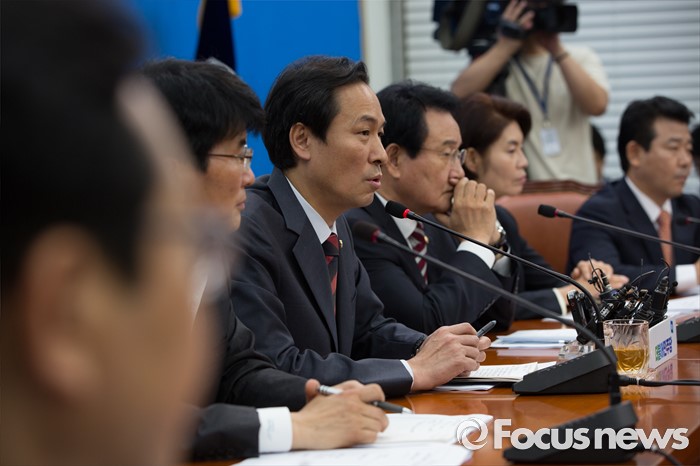 (서울=포커스뉴스) 우상호 더불어민주당 원내대표가 5일 오전 서울 여의도 국회에서 열린 원내대책회의에 참석해 모두발언 하고 있다.