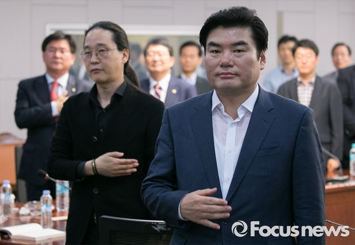 (서울=포커스뉴스) 5일 오전 서울 여의도 국회 의원회관에서 열린 국가미래전략포럼(일명 알파포럼) 2차 세미나에 참석한 원유철(오른쪽) 새누리당 의원과 송길영 다음소프트 부사장 등이 국기에 대한 경례를 하고 있다.