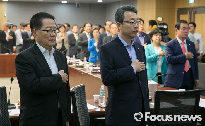 (서울=포커스뉴스) 5일 오전 서울 여의도 국회 의원회관에서 열린 국민의당 의원총회에 참석한 박지원 비대위원장과 김성식 정책위의장 등 의원들이 국기에 대한 경례를 하고 있다.