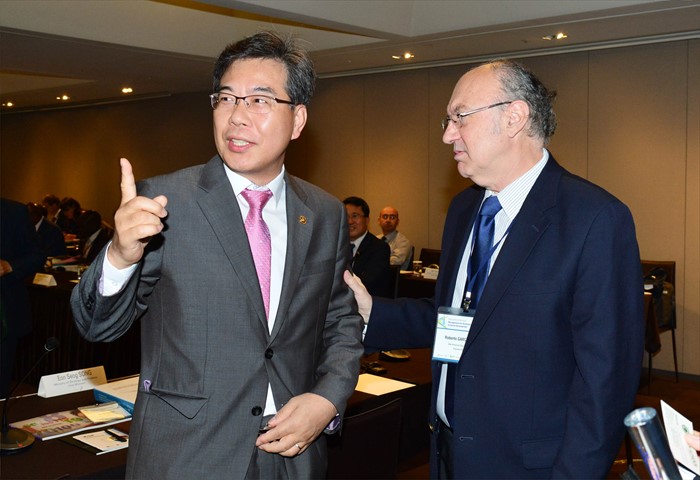 (서울=포커스뉴스) 송언석 기획재정부 차관이 5일 서울시 중구 더 프라자호텔에서 열린 성과중심의 개발정책 국제세미나에 참석해 로베르또 가르시아 로페즈 미주개발은행(IDB) 사무국장과 대화를 나누고 있다.<사진제공=기획재정부>