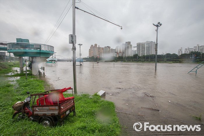 한편 기상청은 5일 오전 9시 현재 서울 등 이외 지역에도 호우특보를 발표했으며, 서울 예상 강수량은 50~100mm로 많은 곳은 150mm 이상의 비가 내릴 전망이다.(서울=포커스뉴스) 최고 300mm 물폭탄이 내릴 것으로 예고되어 전국적으로 호우주의보와 경보가 내린 5일 오전 서울 중랑구 중랑천 월릉교 인근 둔치의 시민공원이 물에 잠겨 있다. 2016.07.05 성동훈 기자