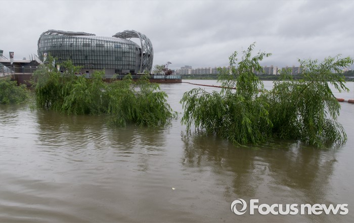 (서울=포커스뉴스) 장마전선이 북상하면서 전국 곳곳에 호우특보가 발표 중인 5일 오전 서울 서초구 반포한강시민공원이 물에 잠기고 있다.