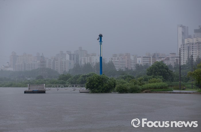 (서울=포커스뉴스) 장마전선이 북상하면서 전국 곳곳에 호우특보가 발표 중인 5일 오전 서울 서초구 반포한강시민공원이 물에 잠기고 있다.