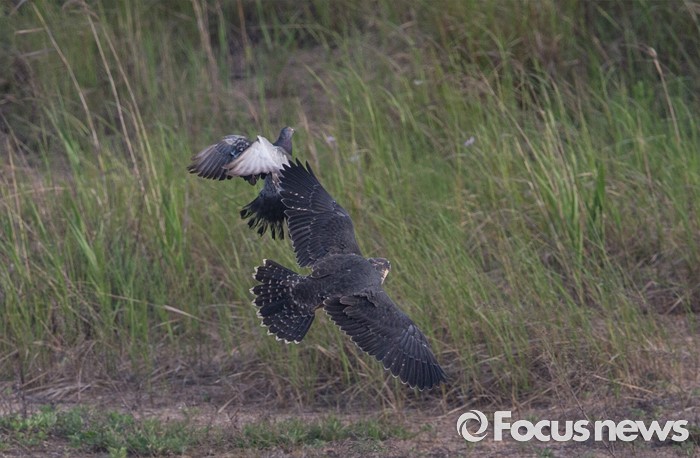 (인천=포커스뉴스) 송골매 유조암컷이인천시 수도권매립지에서비둘기를 뒤좆고 있다.