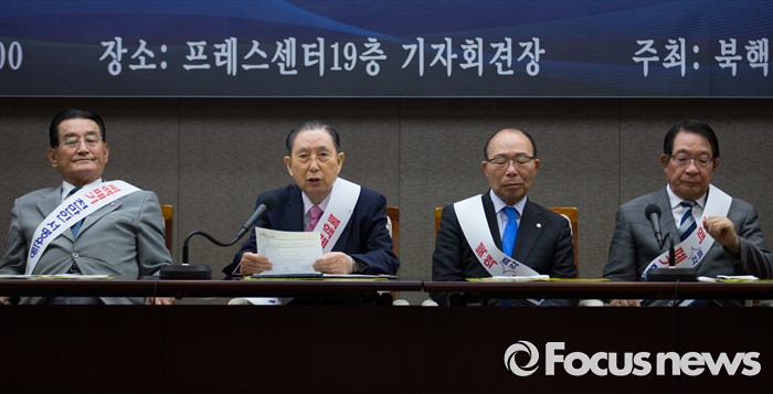 (서울=포커스뉴스)5일 오전 서울 중구 프레스센터에서 열린 북핵폐기 천만인서명, 250만명 돌파 기자회견에 참석한 이종윤(왼쪽 두번째) 목사가 인사말 하고 있다.