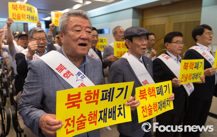 | △ '북핵폐기, 전술행 재배치 촉구 구호 외치는 관계자들 |