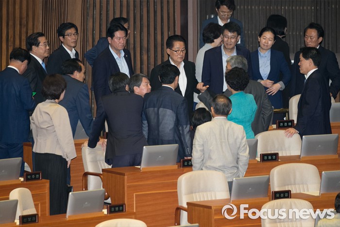 (서울=포커스뉴스) 5일 오전 서울 여의도 국회에서 343회 국회(임시회) 7차 본회의, 정치·외교·통일·안보·교육·사회·문화에 관한 질문이 이장우 새누리당 의원 등과 김동철 국민의당 의원의 언쟁으로 정회된 후 박지원 국민의당 원내대표, 안철수 전 대표 등 의원들이 논의하고 있다.