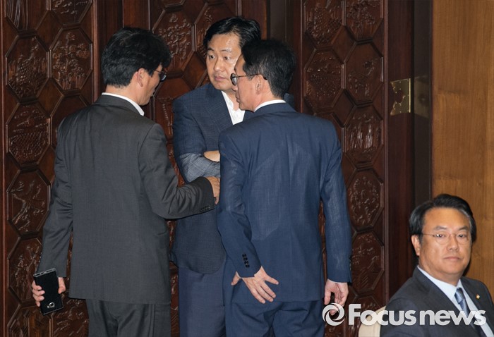 (서울=포커스뉴스) 5일 오전 서울 여의도 국회에서 열린 343회 국회(임시회) 7차 본회의, 정치·외교·통일·안보·교육·사회·문화에 관한 질문에 참석한 이장우 새누리당 의원 등과 김동철 국민의당 의원이 언쟁을 벌이자 김도읍 새누리당 원내수석부대표, 박완주 더불어민주당 원내수석부대표, 김관영 국민의당 원내수석부대표가 논의하고 있다.