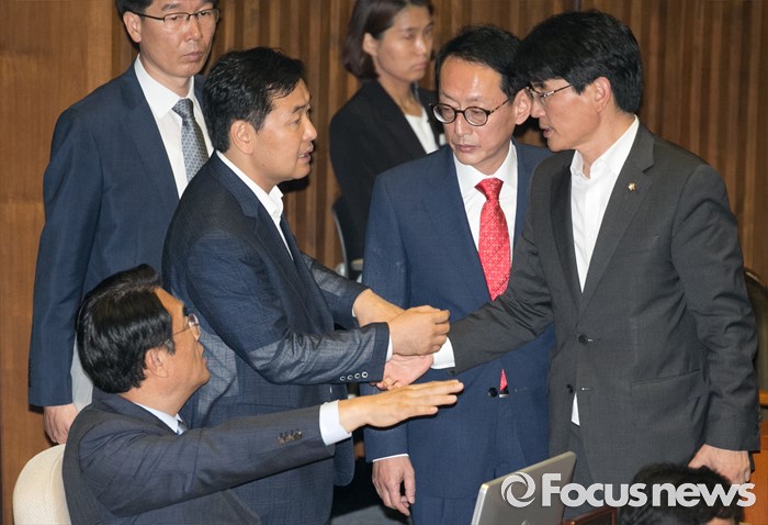 (서울=포커스뉴스) 5일 오전 서울 여의도 국회에서 열린 343회 국회(임시회) 7차 본회의, 정치·외교·통일·안보·교육·사회·문화에 관한 질문에 참석한 이장우 새누리당 의원 등과 김동철 국민의당 의원이 언쟁을 벌이자 정진석 새누리당 원내대표와 김도읍 새누리당 원내수석부대표, 박완주 더불어민주당 원내수석부대표, 김관영 국민의당 원내수석부대표가 논의하고 있다.