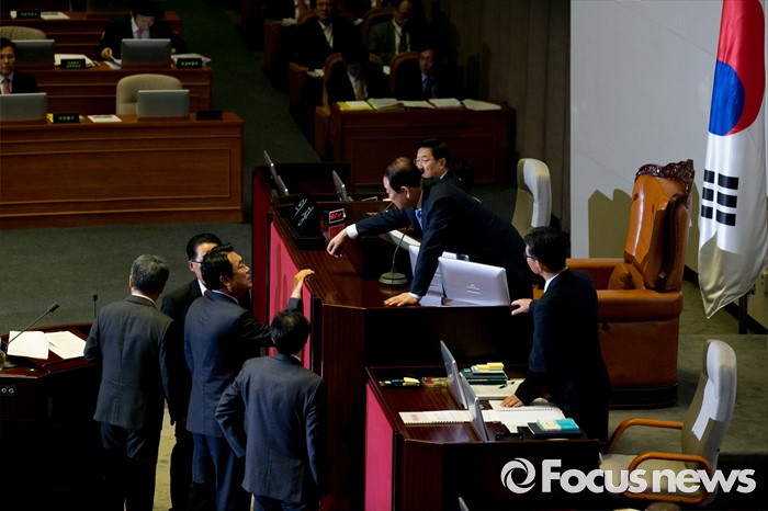 (서울=포커스뉴스) 5일 오전 서울 여의도 국회에서 열린 343회 국회(임시회) 7차 본회의, 정치·외교·통일·안보·교육·사회·문화에 관한 질문에 참석한 이장우 새누리당 의원 등과 김동철 국민의당 의원이 언쟁을 벌이자 정진석 새누리당 원내대표, 우상호 더불어민주당 원내대표, 박지원 국민의당 원내대표와 박주선 국회 부의장이 회의 정회를 논의하고 있다.