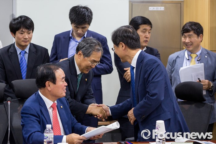 (서울=포커스뉴스) 우윤근(앞줄 가운데) 국회 사무총장과 천정배(앞줄 오른쪽) 국민의당 전 공동대표가 5일 오후 서울 여의도 국회의원회관에서 열린 '2017년 국비확보관련 광주 및 전남 국회의원 간담회'에 참석해 악수 하고 있다.