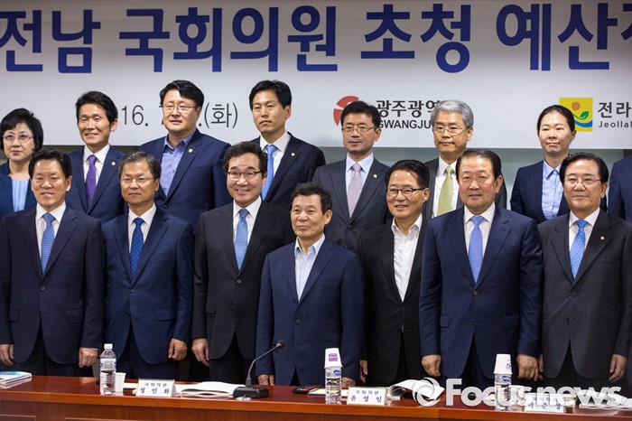 (서울=포커스뉴스) 이낙연(앞줄 왼쪽 세번째) 전라남도 도지사와 윤장현(앞줄 오른쪽 네번째) 광주광역시 시장을 비롯한 광주, 전남 국회의원들이 5일 오후 서울 여의도 국회의원회관에서 열린 '2017년 국비확보관련 광주 및 전남 국회의원 간담회'에 참석해 사진촬영을 하고 있다.