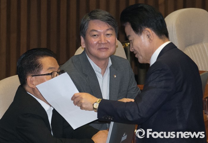 (서울=포커스뉴스) 5일 오전 서울 여의도 국회에서 열린 343회 국회(임시회) 7차 본회의, 정치·외교·통일·안보·교육·사회·문화에 관한 질문에 참석한 안철수(가운데) 국민의당 전 대표, 박지원(왼쪽) 비대위원장, 정동영 의원이 대화하고 있다.