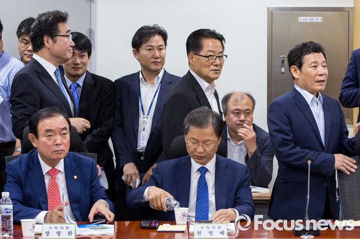(서울=포커스뉴스) 박지원(두번째줄 가운데) 국민의당 비상대책위원장과 이낙연(두번째줄 왼쪽) 전라남도 도지사, 윤장현(오른쪽) 광주광역시 시장이 5일 오후 서울 여의도 국회의원회관에서 열린 '2017년 국비확보관련 광주 및 전남 국회의원 간담회'에 참석하기 위해 회의실로 들어서고 있다.